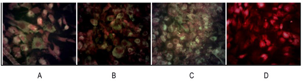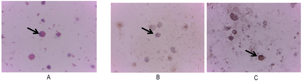 Sarcospheres were were grown in 8-well tissue culture plate (CorningInc, Corning, NY). The cells were fixed in methanol for 2 minutes, then in acetone for an additional 2 minutes. Slides were rinsed three times using PBS (Invitrogen, USA). Following fixation, Primary antibodies for alkaline phosphatase (EPR4477) ab 108337 (Abcam, USA), osteocalcin (OC4-30) ab 13418 (Abcam, USA), CD 133/1 (AC 133) (MACS, Germany) were added to slides and incubated at 370C temperature for 60 minutes. Slides were rinsed three times with PBS and secondary antibodies which had been labeled by FITC were added. Incubation was performed at 370C temperature for 60 minutes. Evans Blue (Sigma, USA) staining was added to the slides and incubated at room temperature for 2 minutes. Slides were rinsed in PBS (Invitrogen, USA) viewed under a fluorescence microscope at 20x and 40x magnification (Nikon, Japan).