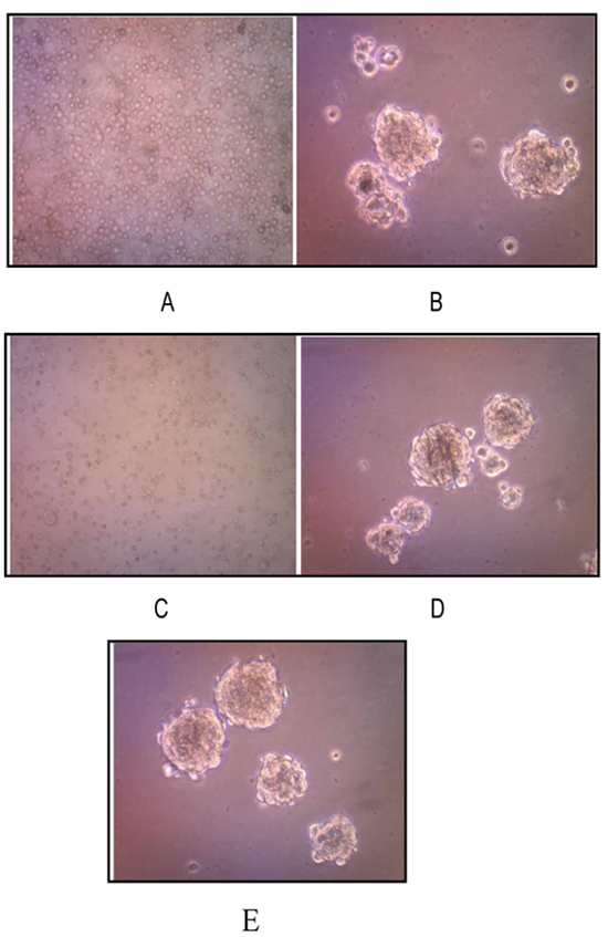 We successfully isolated and cultured CSCs from human osteosarcoma cell cultures growing them in the stem cell serum free medium. These cells, representing a subset of human osteosarcoma cells possess stem cell-like features, retaining the ability to self-renew in vitro. Osteosarcoma stem-like cells showed three-dimensional sphere clusters (sarco-spheres) in slightly hypoxic condition in the first three days.Those osteosarcoma stem like-cells were not attached (non-adherent) to substrate with tight density. Sarcospheres were able to produce normal adherent cell cultures (Fig. 3).