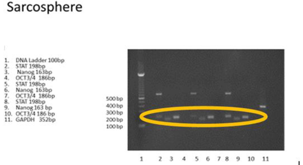 The culture sphere-of the osteosarcoma cells showed three dimension round shaped colonies (sarcospheres) in slightly hypoxicand serum free condition which was not attached to the substrate with tight density. RT-PCR demonstrated that sarcospheres expressed genes which encode NANOG, Oct3/4 STAT 3, but not for CD 133. IFA showed positive protein expression of ALP, osteocalcin and CD 133 which was moderate, strong, and weak positive respectively. Sarcospheres also had a positive reaction toward alizarin red staining.