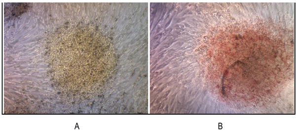 Fig. (6). We reveled that sarcospheres produced calcium in vitro. Alizarin red staining results on adherent culture plate. (A) On day 3; (B) On day 7. At 32x magnification. |