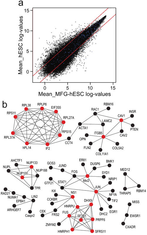 Global analysis of microarray data demonstrates that MFG-hESCs and hESCs display a similar gene expression profile, with 74% of the genes exhibiting a FC≤3 (Fig. 2a) and a Pearson correlation coefficient of 0.94. Protein-protein interaction analysis of differentially expressed genes (FC ≥3) identifies 11 hub genes with increased expression in MFG-hESCs compared to hESCs, including the ribosomal genes RPLP2, RPL38, RPL37A, RPL27A, RPS11, RPS15, IF2, nPL14 and EIF3S5, and two genes belonging to the family of integrins, such as ITGB5 and CAV1 (Fig. 2b). For genes with a decreased expression in MFG-hESCs, five clusters are identified, of which one contains the NUP133 and NUP100 genes and the other the JUN, MXI2, NS1, FUS, DHX9, HNRPU, HNRPH1, SF3B1, PRPF6, and SFRS11 hub genes (Fig. 2c).