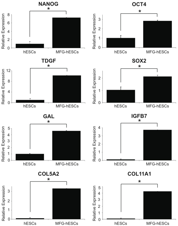 Real-time PCR was used to confirm the expression of some of the genes specifically expressed in hESCs, or under- and over-expressed in hESC compared to differentiated cells, such as NANOG, OCT4, TDGF1, GAL, SOX2, IGFBP7, COL5A2, and COL11A1. The results in Fig. (3) show that the pluripotency-associated NANOG, OCT4, TDGF1, and SOX2 genes are more highly expressed in MFG-hESCs than in hESCs. No significant differences are observed when comparing the expression of the other investigated genes.