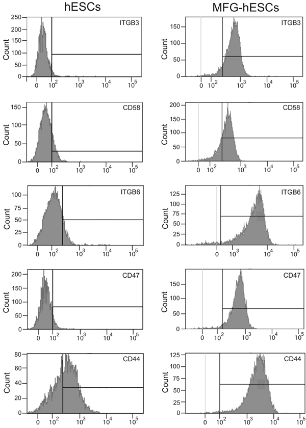 The increased expression of surface adhesion molecules in MGF-hESCs compared to hESCs was verified by flow cytometry. The results confirm that MGF-hESCs display higher expression of the integrins ITGB3 and ITGB6, and the cell adhesion markers CD58, CD47, and CD44 compared to hESCs (Fig. 4).