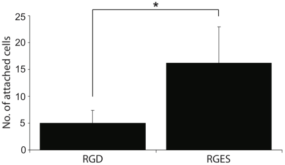 In order to determine whether the higher expression of integrins on the MFG-hESCs was responsible for the ability of these cells to attach and grow on regular plastic culture dishes, the cells were cultured in the presence of RGD or RGES peptides. The results in Fig. (5) show significantly less cell attachment when MFG-hESCs are cultured in the presence of the RGD peptides compared to the RGES peptide, with approximately 65% less cell attached in the presence of RGD peptides.